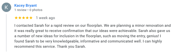 The Rapid Review is not a full redesign service. It is a focused, expert review of your current floor plan and design. Sarah will suggest practical improvements to areas like layout, functionality, sustainability, and more, but always based on your existing design. If you’re looking at a more comprehensive redesign, Architect GP has other services and workshops more suitable to your needs.